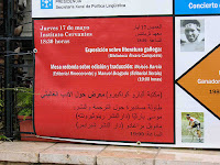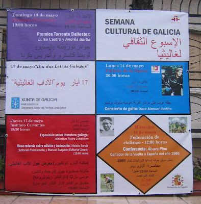 Abriu o acto o director do Instituto, Antonio Gil Carrasco (un anfitrión delicadísimo, como a súa compañeira Mari Ángeles), que falou a maior parte do tempo en árabe, salientando o compromiso que o centro tiña coa figura de Álvaro Cunqueiro e coa proxección da cultura e literatura galega no mundo árabe. Iniciei a miña intervención recordando a figura de María Mariño e explicando as razóns da celebración do 17 de maio con Día das Letras Galegas. A continuación proporcionei algúns datos básicos sobre a edición en galego, para rematar bosquexando unha panorámica da actual literatura galega, con especial atención á narrativa. Pola súa banda, Moisés R. Barcia presentou a experiencia de Rinoceronte, como especializada en tradución ao galego de literatura de calidade das máis diversas linguas, expresando tamén as posibilidades de que a editorial no futuro acometa o proxecto de traducir literatura galega a outras linguas, unha estratexia exitosa que veñen realizando editoras islandesas.