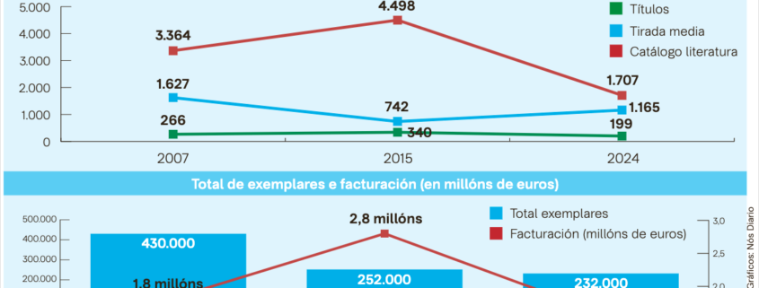 Datos de 2024 que comparados cos do ano 2007, tras a aprobación da Lei do Libro e a Lectura, momento do maior fulgor da edición galega na Autonomía, indican que a edición de Literatura retrocede en todos os eidos: en títulos o 25,18 %; en exemplares o 46,10 %; en tirada media no 28,39 %, a pesar de que está por riba do sector, 1.099; en catálogo o 49,26 %, froito das descatalogacións masivas, que afectan a todas as modalidades, coa intención de reducir custes de almacenamento, sobre todo, das editoras tractoras do sector (Xerais e Galaxia); e mesmo en facturación o 11,10 %, tras acadar en 2015 o 2,8 millóns de euros, o que na última década acentuaría a perda de vendas literarias nun 42,85 %. Cifras que non poden agochar o paso atrás, compartido coas modalidades de Libro de Texto e de Non Ficción, sufrido pola edición literaria impresa en galego, a pesar da súa resiliencia. Descenso mitigado polo desenvolvemento dunha edición dixital, atenta a ofrecer a posibilidade de lectura en pantallas, sobre todo, de novela, como se pode comprobar no catálogo dispoñible do programa «GaliciaLe», que supera os dous mil títulos, sendo xa superior ao dispoñible en formato impreso.