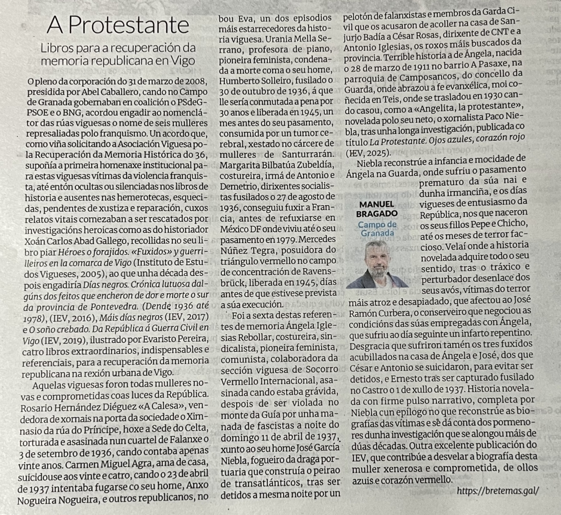 Dedico o artigo da semana en Faro de Vigo a publicación do libro La Protestante (IEV 2025) de Paco Niebla: