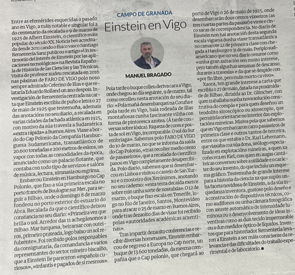 Entre as efemérides esquecidas o pasado ano en Vigo, a máis notable e singular foi a do centenario da recalada o 9 de marzo de 1925 de Albert Einstein, o científico máis popular do século XX. Noticia ben acreditada dende 2011 cando o físico vasco Santiago Rementería Sanz publicou o artigo «Un testimonio del interés de Einstein por las aplicaciones tecnológicas» na Revista Española de Historia de las Ciencias y las Técnicas. Visita do profesor xudeu rescatada en 2016 nas páxinas de Faro de Vigo polo noso sempre admirado Ceferino de Blas e que relataría Eduardo Rolland un ano despois. Investigación de Rementería centrada na carta que Einstein escribiu de puño e letra o 27 de maio de 1925 que testemuña, ademais das anotacións no seu diario, a recalada en varias cidades da fachada atlántica en 1925, con motivo da súa travesía a Sudamérica «extra rápida» a Buenos Aires. Viaxe a bordo do Cap Polonio da Compañía Hamburguesa Sudamericana, transatlántico de 20.600 toneladas e 200 metros de eslora, un vapor con todas as comodidades da época, anunciado como un palacio flotante, que contaba con todo tipo de servizos e salóns de música, lectura, ximnasia ou esgrima.