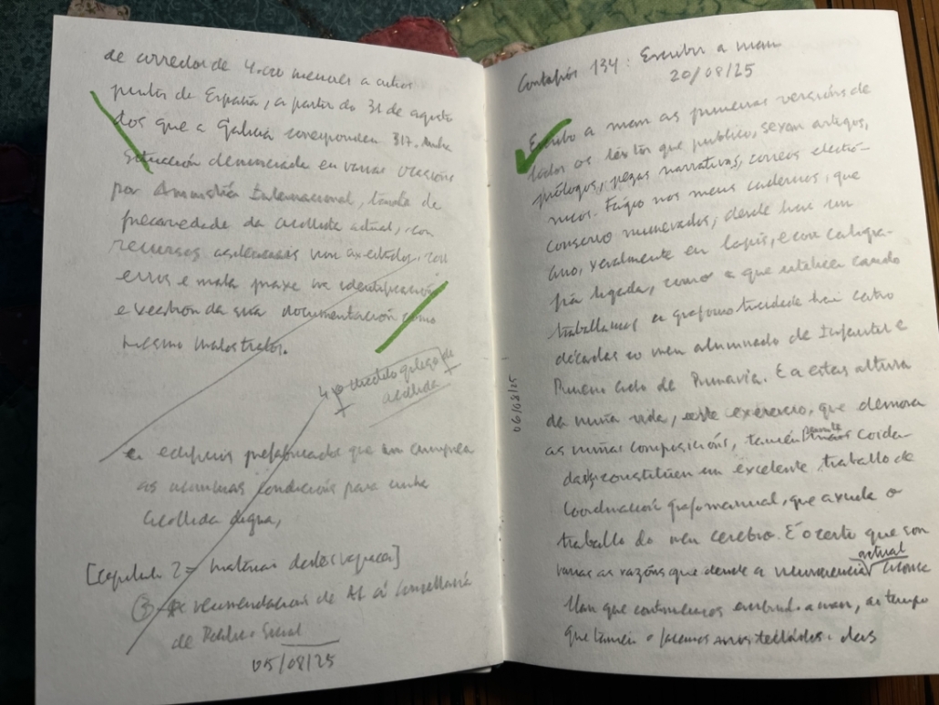 Escribo a man as primeiras versións de todos os textos que publico, sexan artigos ou presentacións. Fágoo nos meus cadernos, aos que chamo «brétemas», que conservo numerados na biblioteca, xeralmente a lapis afiado e con caligrafía ligada escolar, como a que aprendín hai catro décadas cando me formei en grafomotricidade con Juan Antonio García Núñez, descompoñendo a escritura nunha combinación entre trazos horizontais, verticais e bucles arriba e abaixo. A esta altura da miña vida, utilizar a escritura manual, a pesar de demorar a produción textual, constitúe un excelente traballo artesán que contribúe a estimular a miña actividade cognitiva. E o certo é que son numerosas as razóns que dende a neurociencia aconsellan que continuemos escribindo a man, ao tempo que o facemos nos teclados das computadoras e dixitamos nas pantallas de teléfonos e tablets. A escritura a man é a nosa primeira marca de identidade, activa a memoria en movemento e a forma na que absorbemos a información, cultiva a paciencia e estimula a expresión creativa. Compromete a actividade da maior parte do cerebro, sobre todo daquelas rotinas adestrables como a motricidade fina, habilidade cognitiva que permite a fluidez do útil e a continuidade do trazo premendo de forma suficiente sobre o papel. A caligrafía é unha actividade artesanal e sensorial na que están comprometidas as mans, os brazos como a totalidade do corpo, polo que son comprensibles as apelacións literarias que reclaman que vivir é escribir con todo o corpo, ou que a escritura manual é unha forma primeira de afirmación da vida. Quizais sexa por esta razón utilitaria pola que países como Noruega, que abandonaron nas aulas de Primaria a aprendizaxe da escritura cursiva, trasacorden agora polos beneficios da caligrafía para as aprendizaxes básicas. Coma sucede na lectura, a escritura do noso tempo é híbrida, manuscrita fluída, continua e con afán de permanencia sobre o papel, como a dixital é descontinua, fráxil e permanentemente revisable.